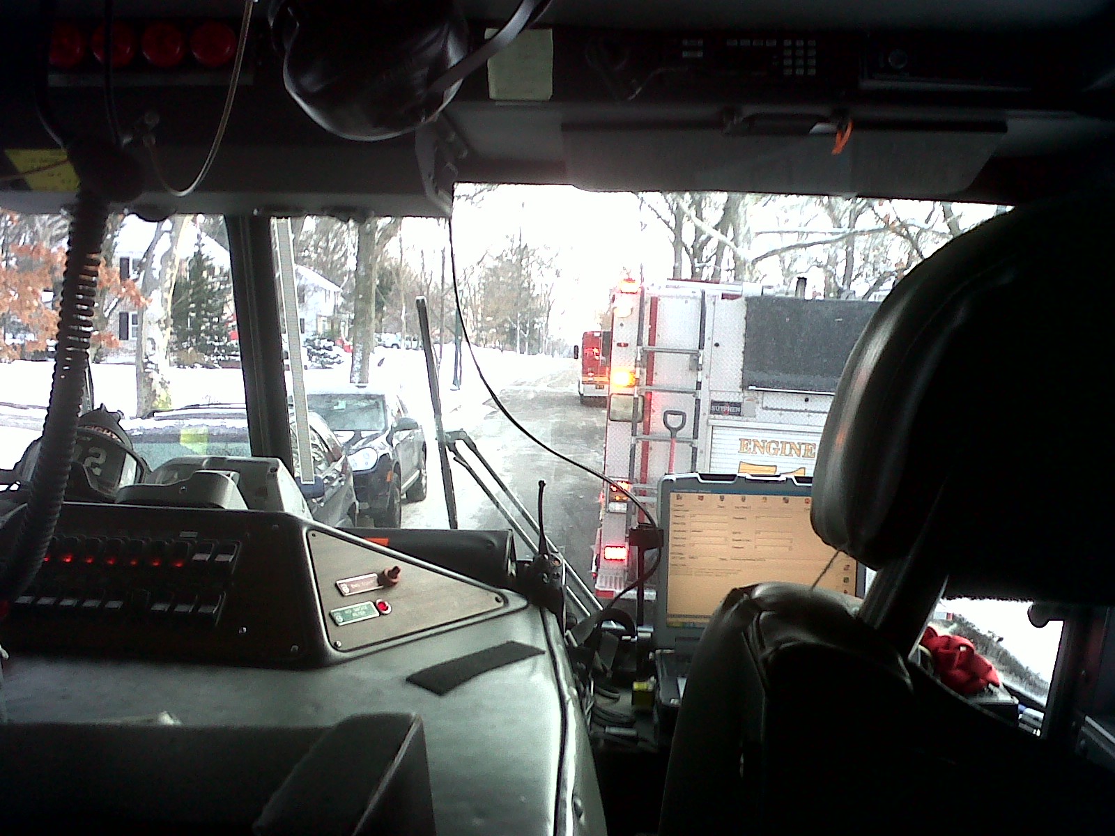 They firefighters immediately stopped their workout and ran upstairs to get their gear on and hop on the truck. We were off with the lights flashing & sirens blaring. It never gets old to be riding in the back of the ladder or medic, I love every time I'm given the opportunity to ride along. When we got on the scene, it was clear the house was not up in flames and in fact, if there was a fire, it was a very small one. The guys told me to stay in the truck since they didn't see anything and didn't expect to be there for very long (and it was cold outside!) I, of course, took the opportunity to take a few pictures with my phone.