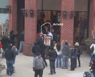 Todd & I were at Easton on Sunday to register at Crate & Barrel for our wedding and decided to take a quick snack break at Bar Louie to watch part of the Ohio State basketball game. Bar Louie is on the second level of the complex and I happen to look out the window when I saw a group of about 20 people walking around the shops. I wouldn't have thought twice about it except I saw police officers mixed in this group. I took a closer look & realized it was Arnold himself doing a little shopping!