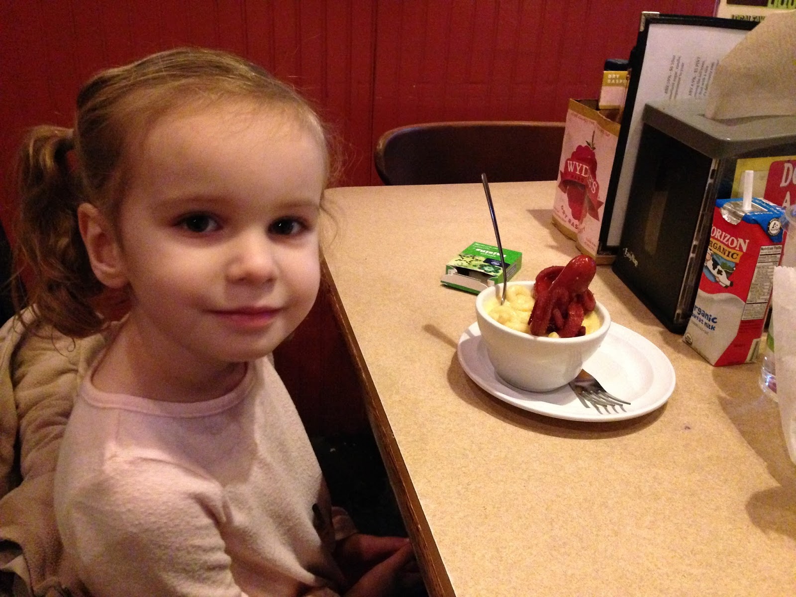 Since Todd was off work all week, he was home when I got home from work on Friday and we decided we'd try to hit up an early dinner/happy hour at Forno in the Short North. Typically, we don't ever go out to dinner on Friday evenings because by the time Todd gets home from work after 6:00 PM, most places would already have a long wait and that doesn't work well with 2 little kids. We got to Forno around 4:45 PM but unfortunately, for us, a lot of other people had the same idea because there was already over an hour wait for a table. Since we were downtown, Todd suggested Dirty Frank's for hot dogs, tots, and cheap beers. We only had to wait about 5 minutes for a table and while it wasn't necessarily what I was hoping we'd have for dinner, I know Todd & Lucy enjoyed it.